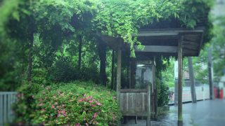季節は夏。田舎のバス停。中央に屋根付きの待合があり、中には三人掛けのベンチ。待合の側にはバス停のポールが立っている。